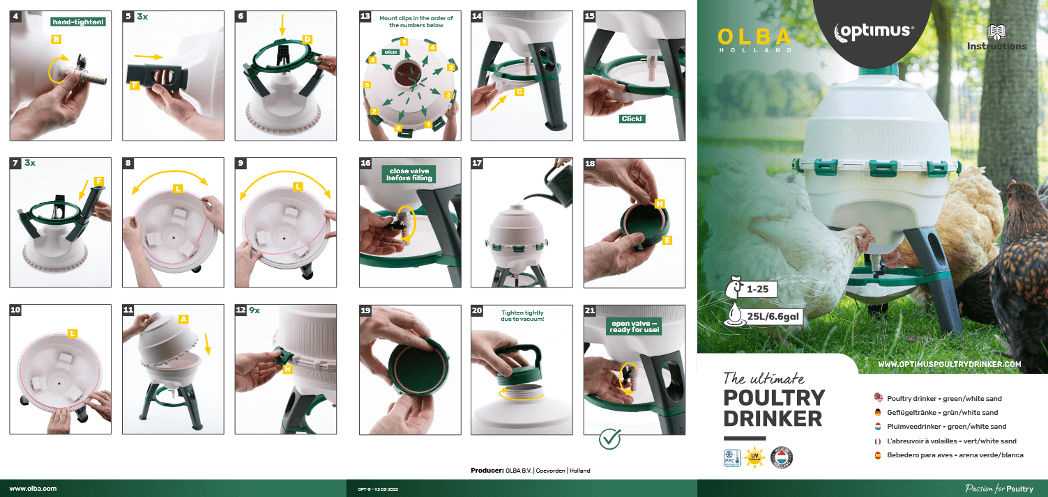 Optimus 25 L napajalnik je prava izbira, če želite poenostaviti vsakodnevno oskrbo perutnine z vodo, zmanjšati delo in izboljšati zdravje živali. Njegova robustnost, enostavno čiščenje in velika kapaciteta pomenijo, da boste dobili več časa zase in več zadovoljstva iz vaše reje.