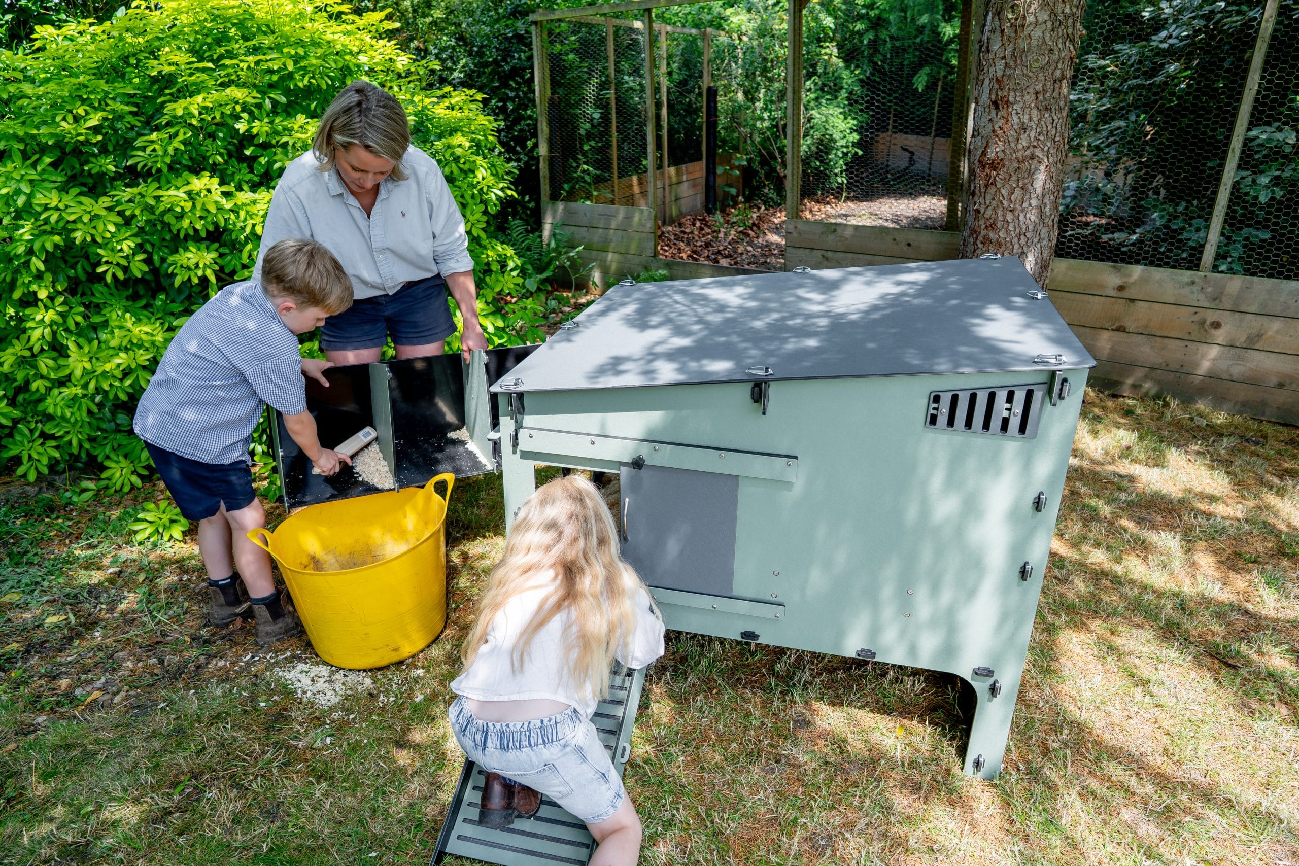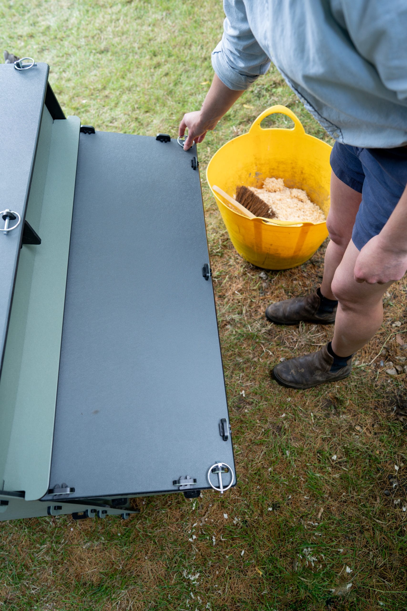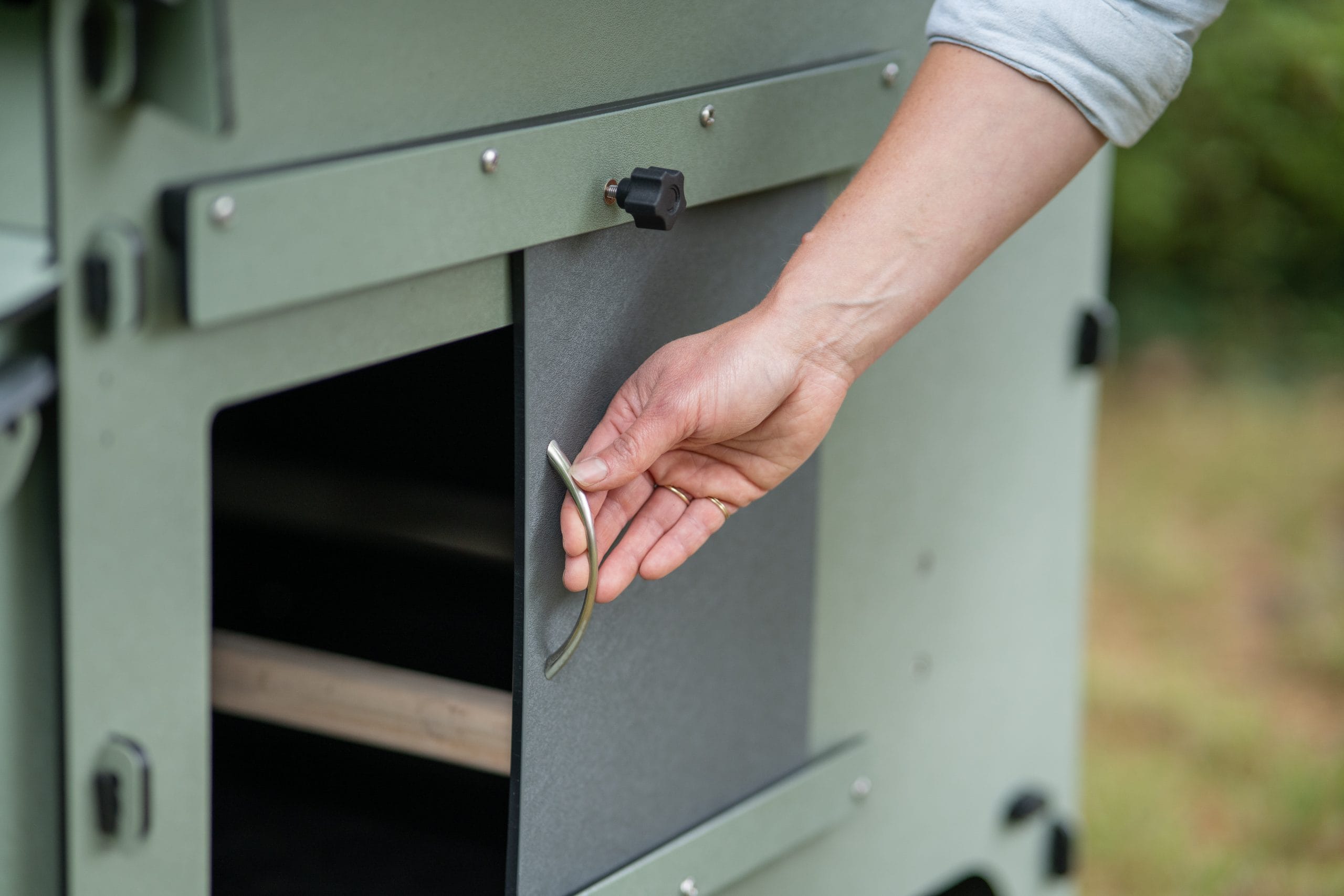 Streha je odstranljiva v nekaj sekundah, notranje elemente lahko snameš brez orodja, gladke površine pa so primerne za pranje z vodo ali visokotlačnim čistilcem. Nova konstrukcija vrat vključuje izboljšan sistem zaklepanja, ki preprečuje vdor lisic in drugih plenilcev. Prezračevanje je nastavljivo in dobro deluje skozi vse letne čase.