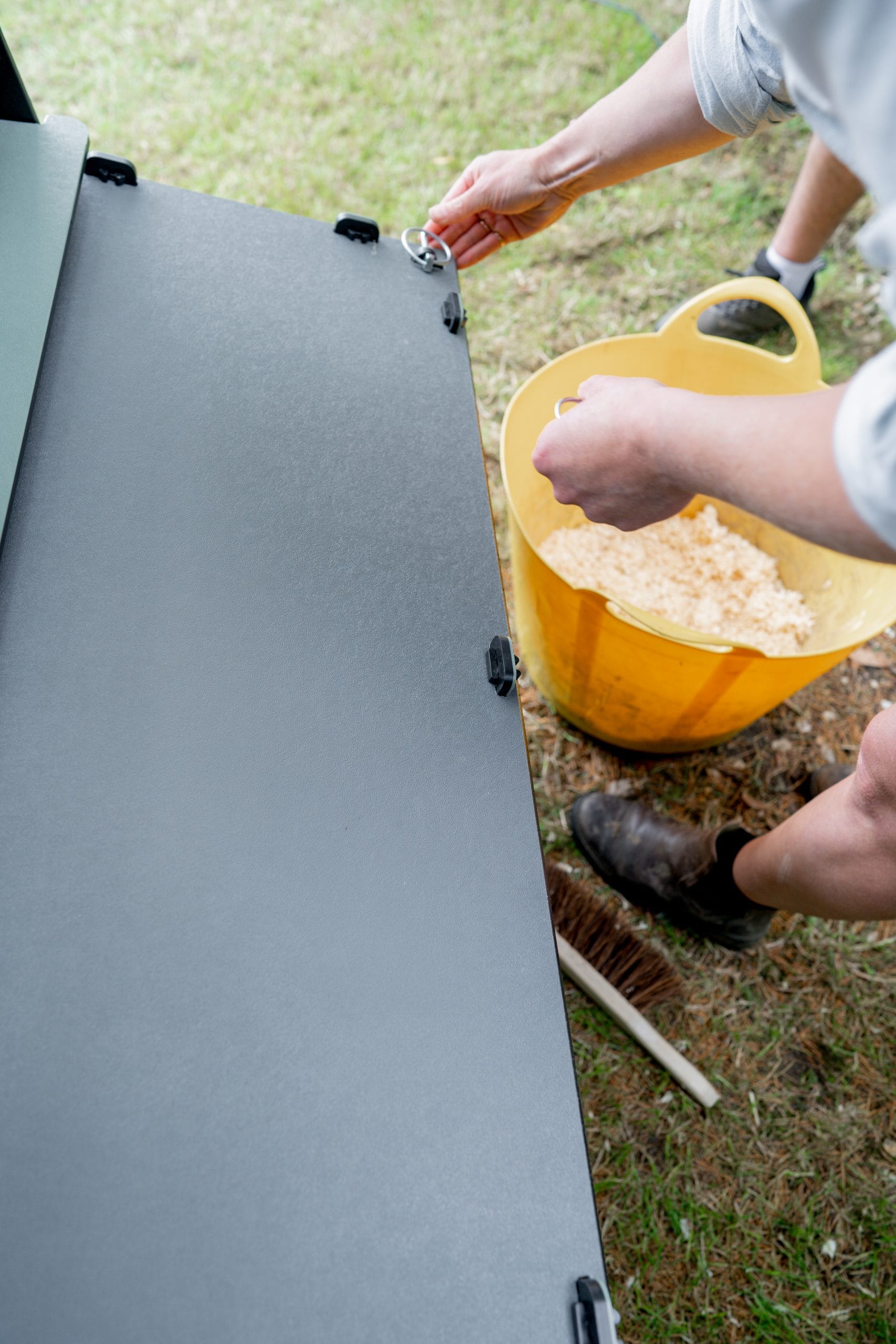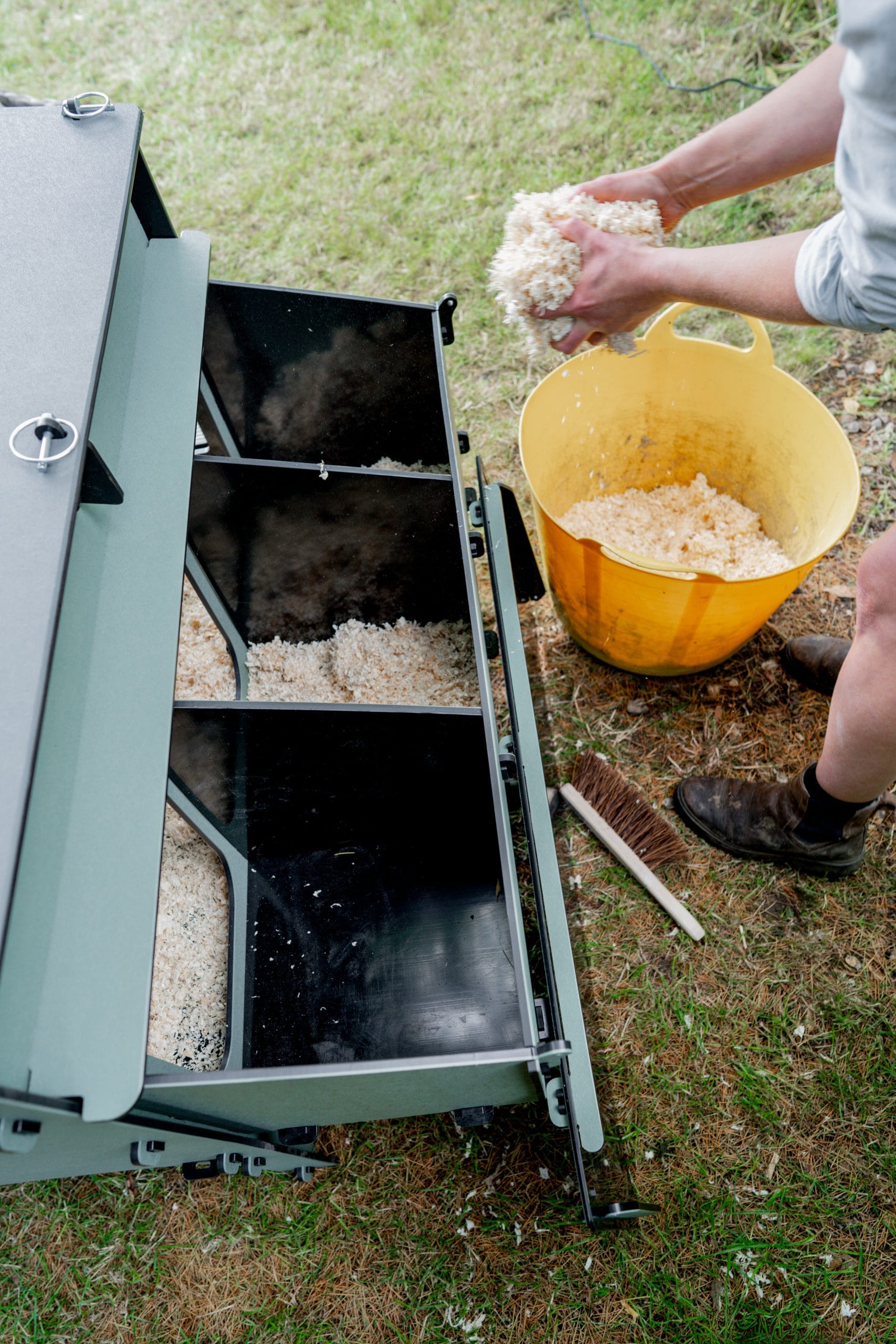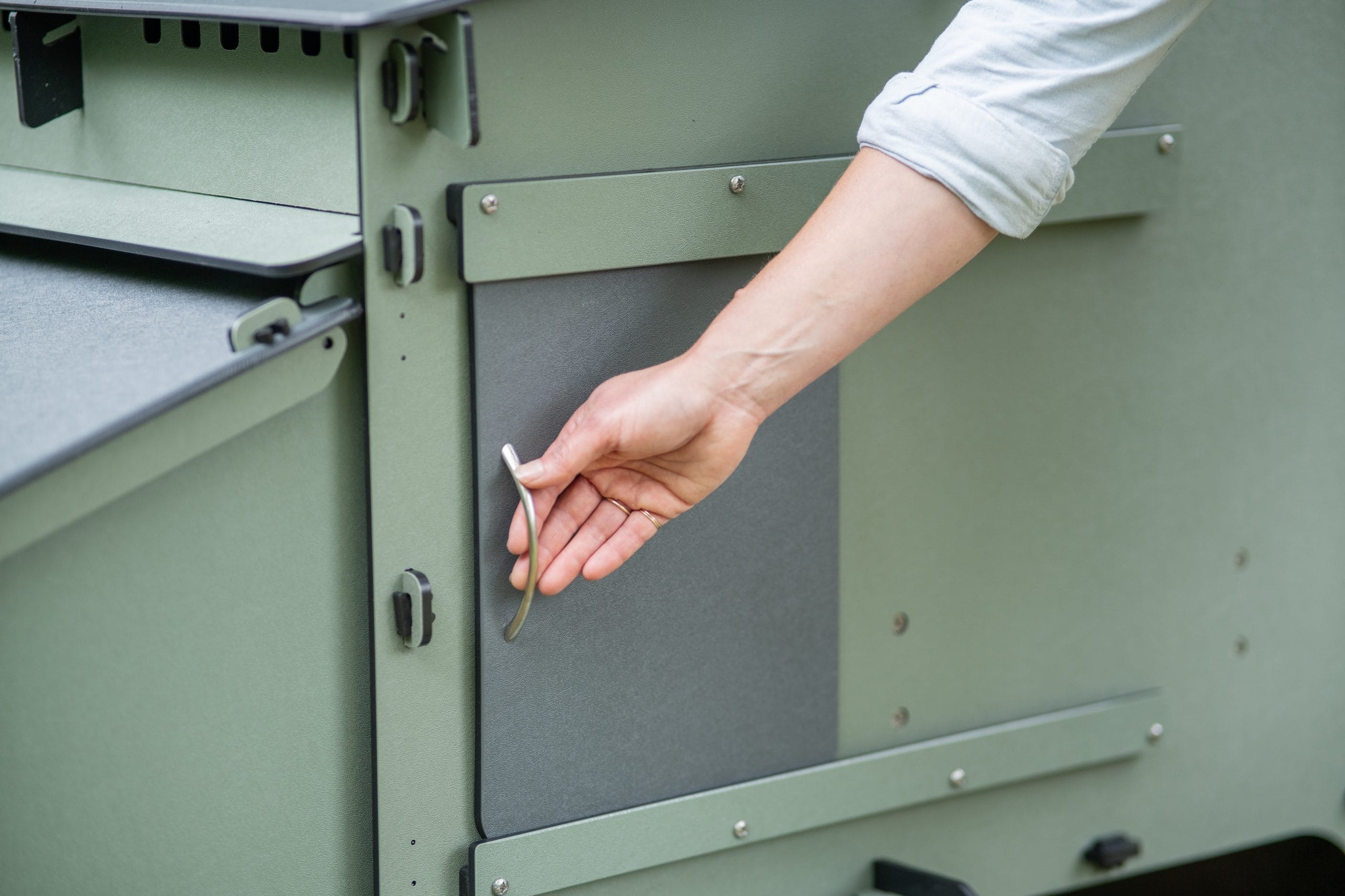 Streha je odstranljiva v nekaj sekundah, notranje elemente lahko snameš brez orodja, gladke površine pa so primerne za pranje z vodo ali visokotlačnim čistilcem. Nova konstrukcija vrat vključuje izboljšan sistem zaklepanja, ki preprečuje vdor lisic in drugih plenilcev. Prezračevanje je nastavljivo in dobro deluje skozi vse letne čase.