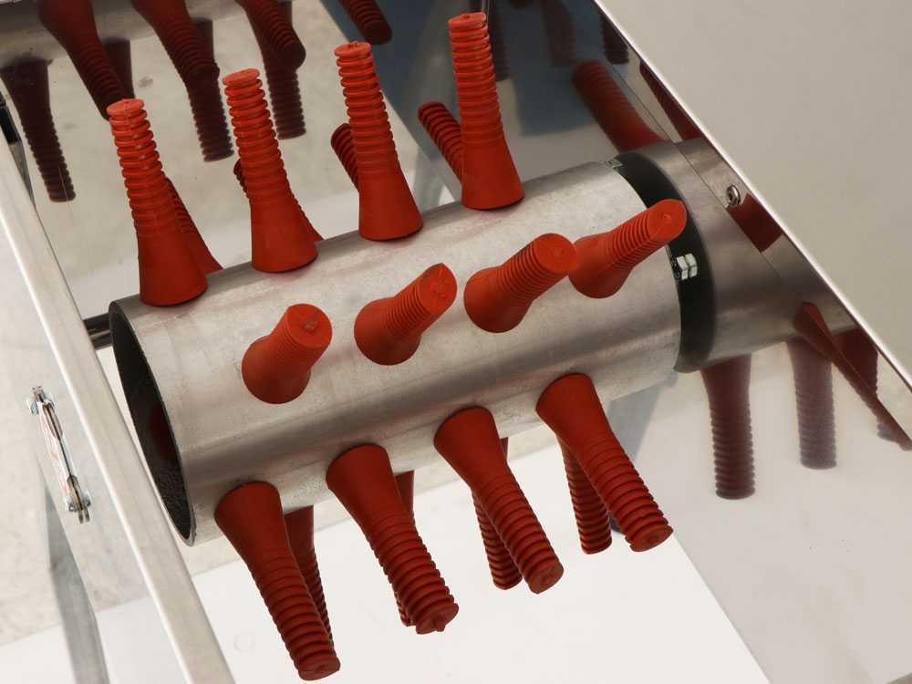 - Delovanje: Valj se vrti v smeri urinega kazalca, medtem ko gumijasti prsti odstranjujejo perje brez poškodb kože.